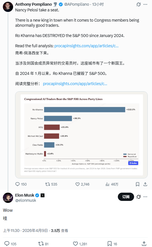 根据 ProCap Insights 对国会股票披露文件的分析,从 2024 年 1 月到 2026 年 4 月,Khanna 以 AI 为重点的交易组合实现了惊人的 112.1% 的超额收益(即超出标普 500 指数同期表现的部分),而此前被认为在国会议员中投资表现最好的佩洛西为 38.5%。