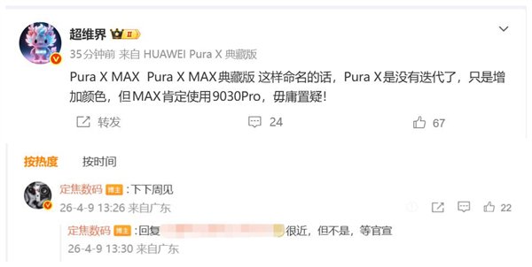 需要注意的是,虽然此前有传言称发布日期为4月21日,但最新消息表明实际时间并非该日期。作为核心升级点,Pura X Max的处理器从Pura X的麒麟9020跃升至麒麟9030 Pro,这也是目前华为旗下性能最为强悍的手机芯片。